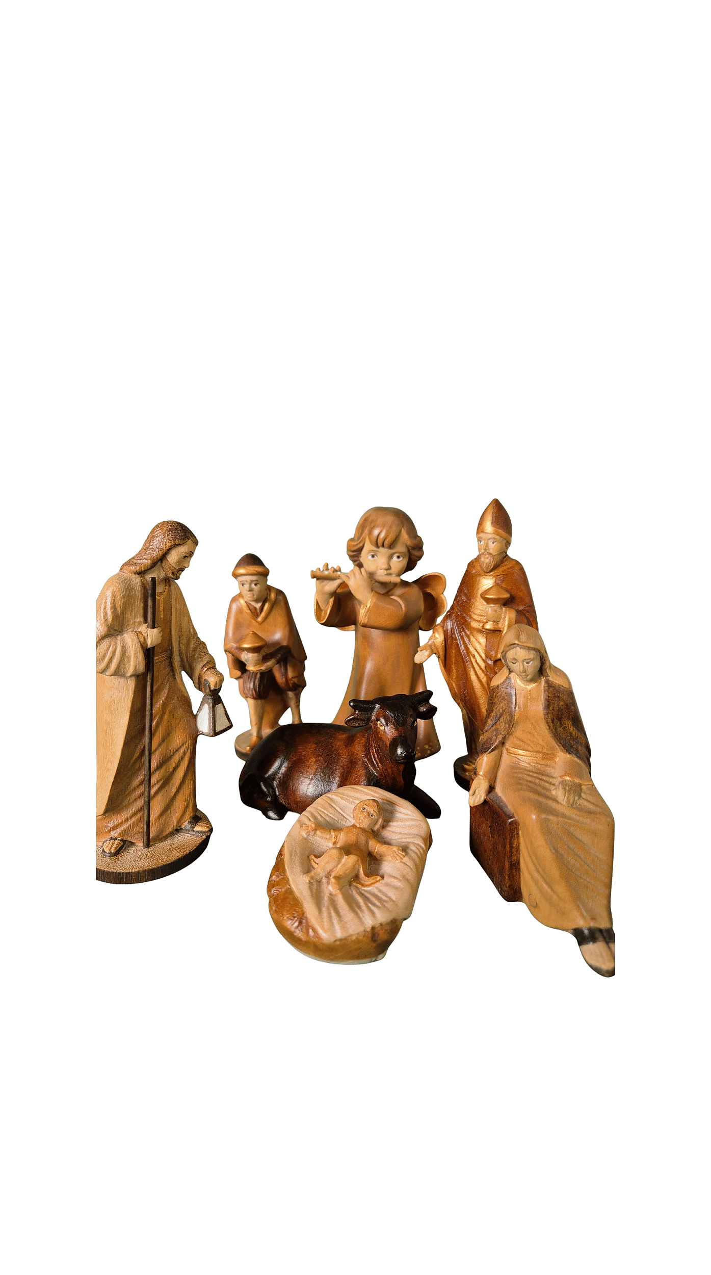 Presépio com 7 peças, José, Maria, Menino Jesus, Rei Gaspar, Rei Baltazar, Anjo, Vaca.